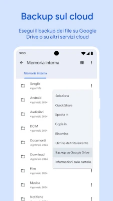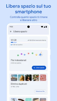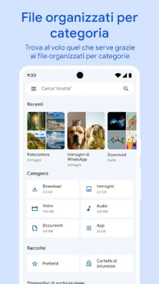 Per massimizzare lo spazio prezioso sul vostro dispositivo, **Files by Google** vi permette di eseguire il backup dei vostri file con facilità. Spostate documenti, immagini e video su Google Drive o su una scheda SD, o scegliete di condividerli con altre piattaforme di archiviazione cloud presenti sul vostro smartphone. Ma la gestione intelligente non si ferma alla sola organizzazione: l'app offre consigli personalizzati e sempre più pertinenti per ottimizzare lo spazio, migliorare la sicurezza e mantenere il vostro dispositivo in perfetta forma. Con un ingombro minimo inferiore a 20 MB, un'interfaccia utente intuitiva e l'assenza totale di pubblicità, **Files by Google** è la soluzione efficiente e discreta che stavate cercando per un controllo completo e sereno dei vostri file.