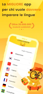 Desideri padroneggiare una nuova lingua asiatica, come il Giapponese, il Coreano, il Vietnamita o il Cinese Mandarino, ma non sai da dove iniziare? Lingodeer trasforma il tuo sogno in realtà, offrendoti un percorso di apprendimento completo e sorprendentemente efficace. Con soli dieci minuti al giorno, Lingodeer ti guida attraverso i fondamenti e oltre, costruendo solide competenze in lettura, ascolto, scrittura e conversazione. La nostra metodologia è studiata per rendere lo studio autonomo non solo efficiente, ma anche incredibilmente gratificante, fornendoti tutto il necessario per progredire a passi veloci.