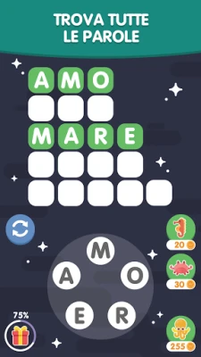 Il meccanismo di gioco di Mare di Parole è tanto intuitivo quanto profondo: ti troverai di fronte a una ruota di lettere e una lista di parole da scoprire. Il tuo compito sarà combinare le lettere disponibili per formare le parole esatte e completare l'elenco. Le sfide iniziano con un dolce riscaldamento, ma preparati, perché la difficoltà crescerà progressivamente, spingendoti a espandere il tuo vocabolario e affinare la tua acuità mentale. Con oltre 5000 schemi unici, ogni rompicapo è un nuovo stimolo per la concentrazione e l'apprendimento, senza alcuna fretta o pressione temporale.
