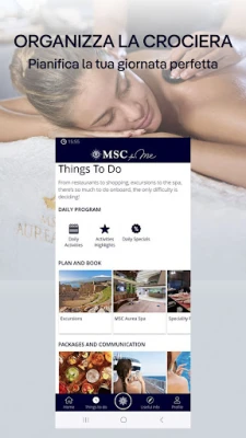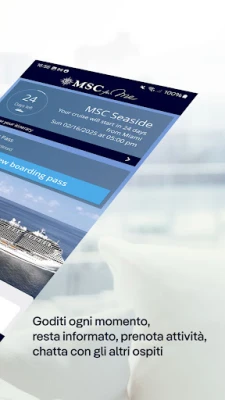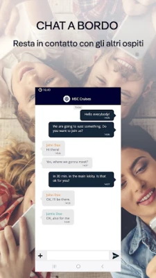 Una volta salpati, MSC for Me continua ad essere il tuo navigatore personale a bordo. Resta facilmente in contatto con i tuoi compagni di viaggio grazie alla chat gratuita integrata, perfetta per coordinare incontri o semplicemente scambiare un saluto. Non perdere neanche un istante della magia MSC: esplora il programma giornaliero, prenota attività, spettacoli o appuntamenti al ristorante e ricevi notifiche personalizzate direttamente sul tuo smartphone per ricordarti gli eventi prenotati, gli orari delle escursioni a terra e qualsiasi altra informazione cruciale.