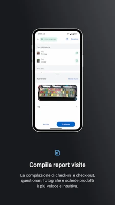 Con ZACapp, redigi report d'intervento in modo semplice ed efficiente. Scatta foto, rispondi a questionari e cataloga prodotti direttamente dall'app. Una soluzione unica, veloce e intuitiva per la gestione dei tuoi interventi sul campo.